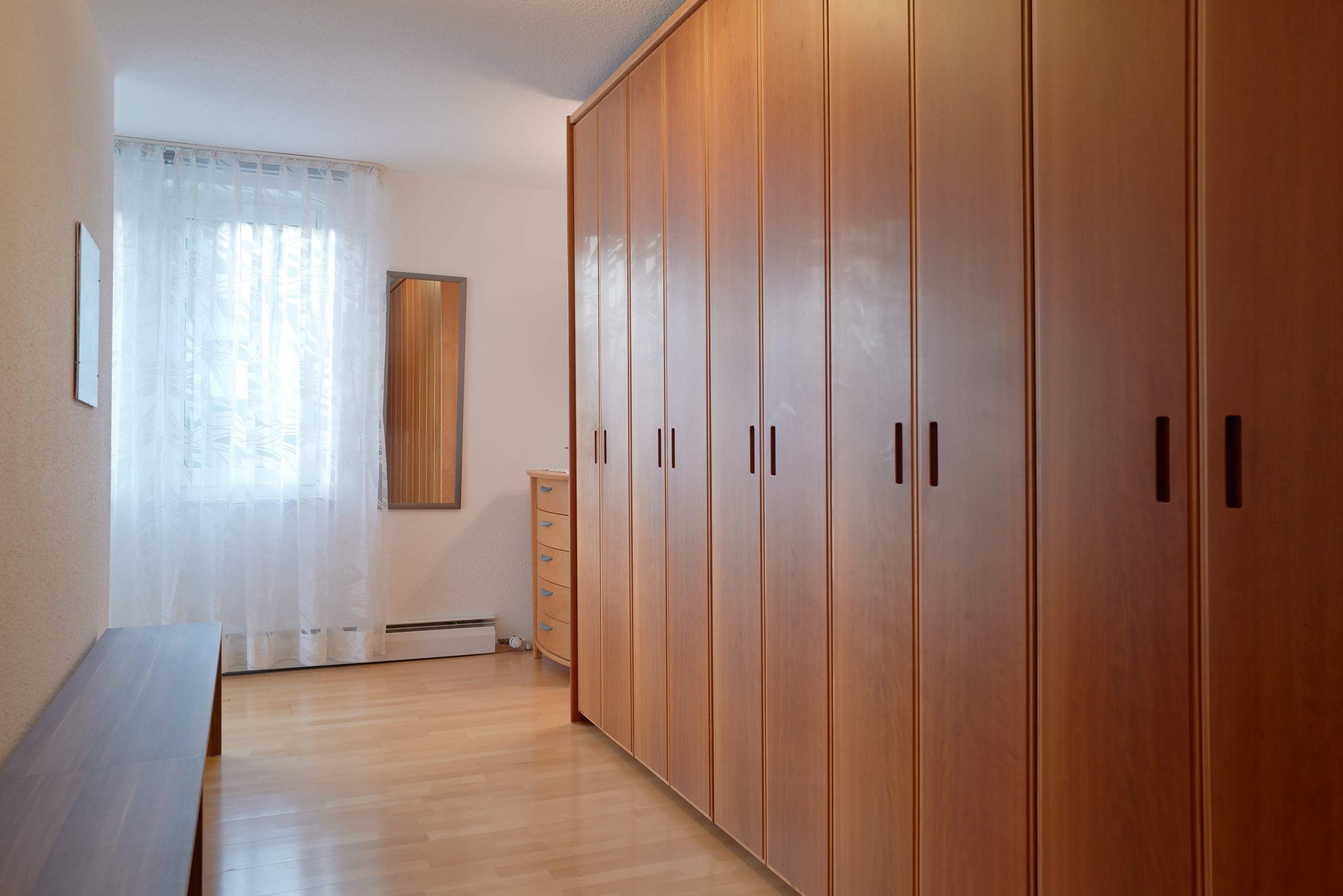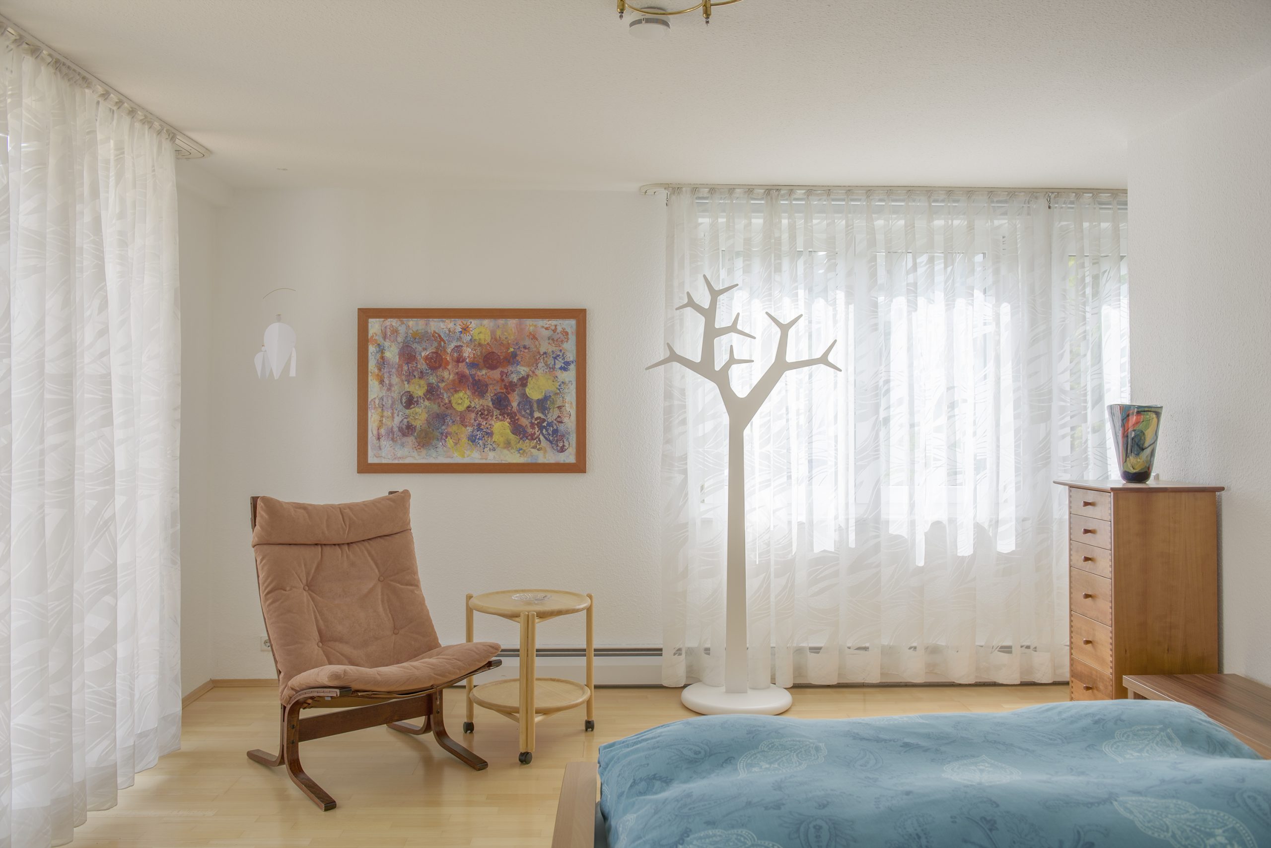 Der helle Raum mit dem Doppelbett 180 x 200 cm (zwei Matratzen) hat Fenster zu zwei Seiten, direkten Zugang zur Terrasse und der Ankleide. Der Raum lässt sich mit Rollos und Jalousien verdunkeln. Ein Sessel lädt zum Schmökern ein.