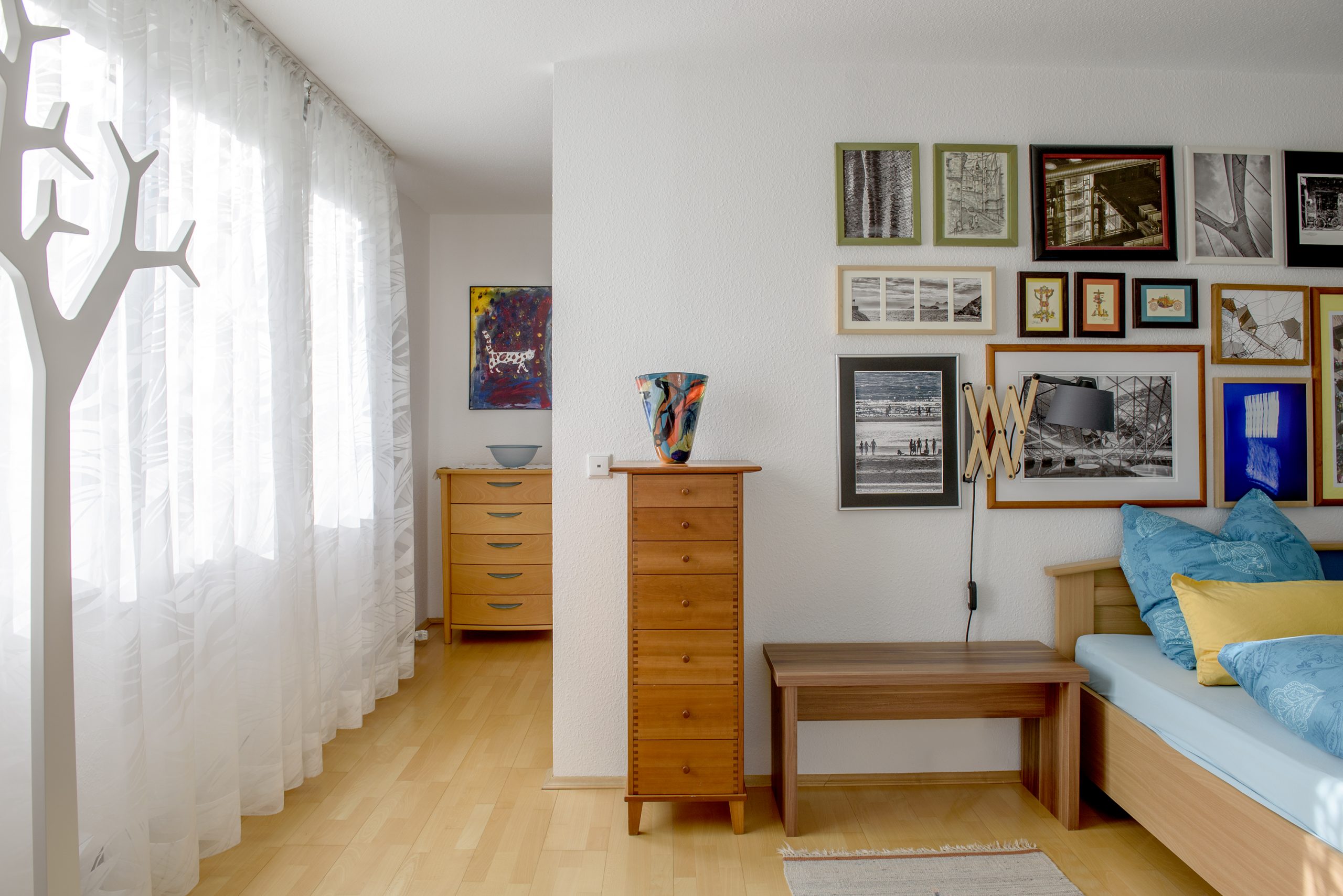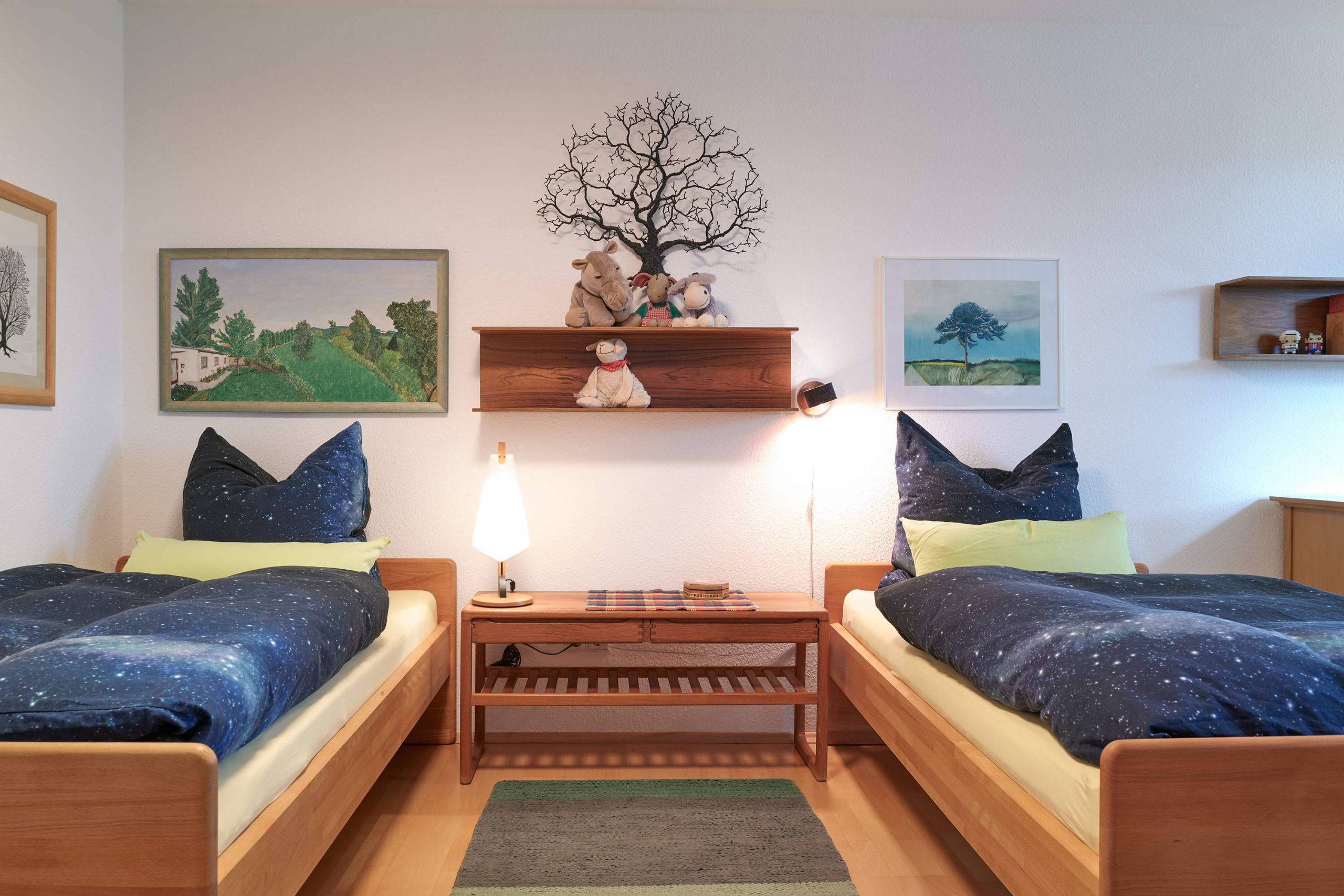 Im kleineren Schlafzimmer mit zwei Einzelbetten (90 x 200) genießen Sie vom Sessel die Aussicht in das kleine Wäldchen. Der Raum lässt sich mit einem Rollo verdunkeln. Das Bücherregal sorgt für Behaglichkeit.